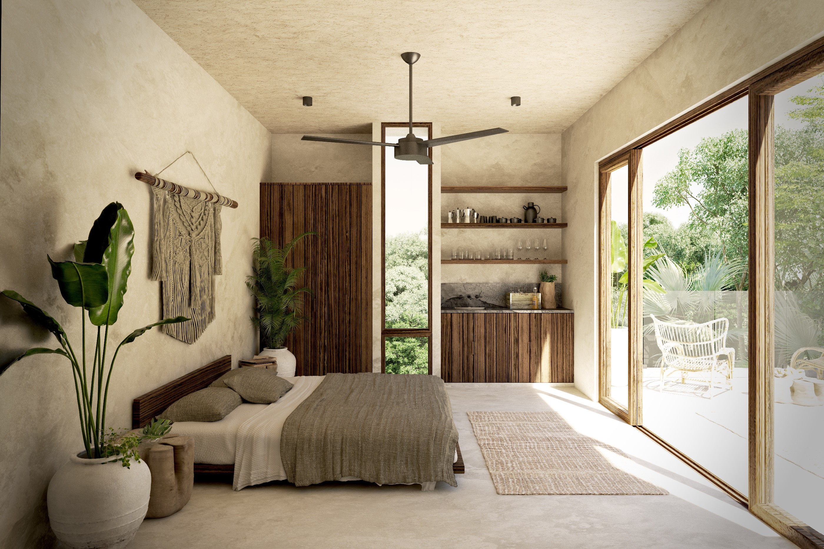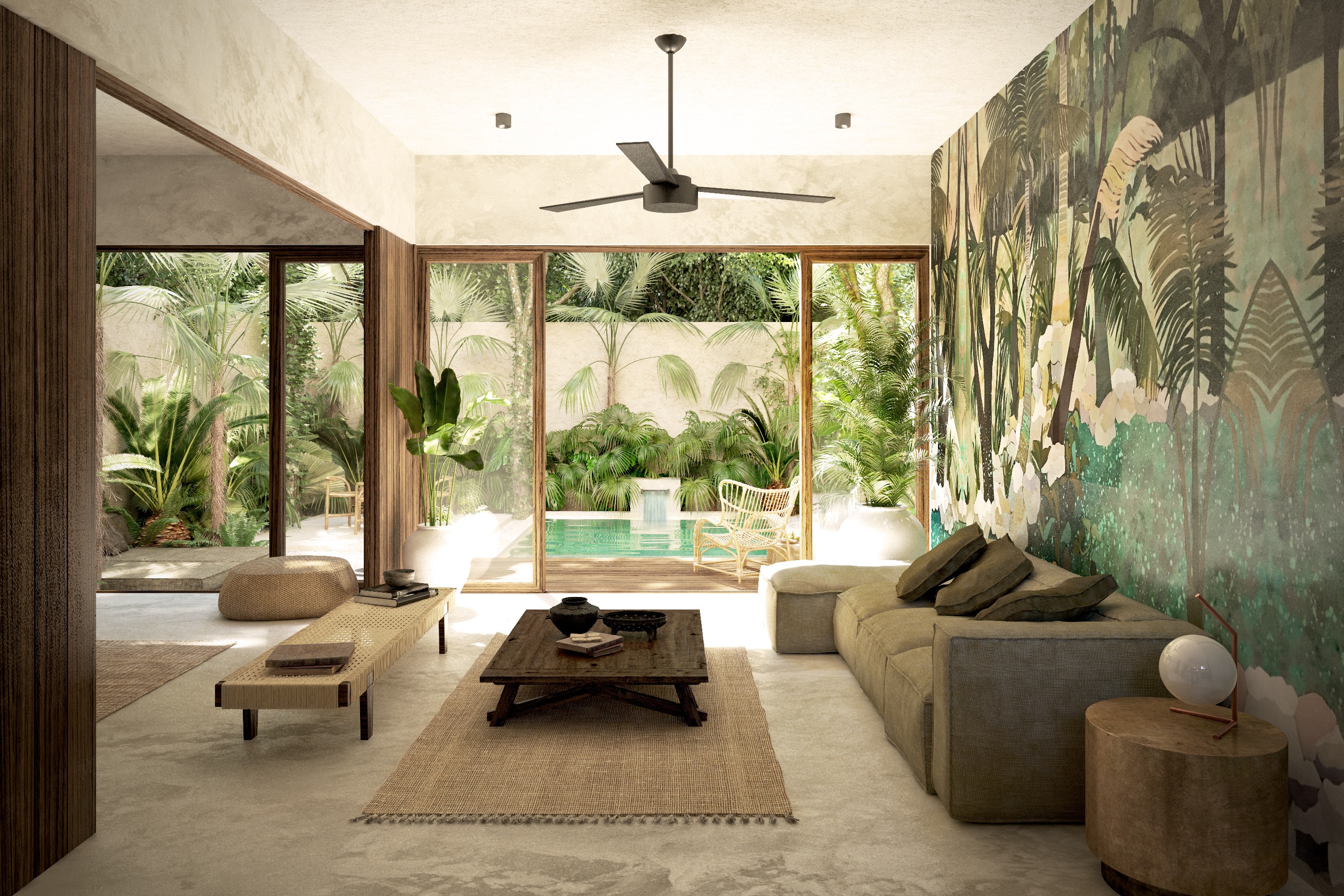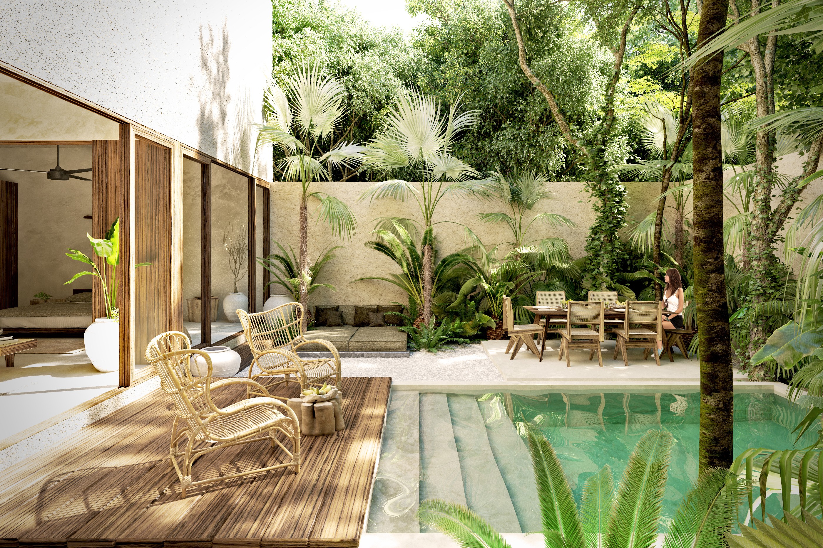 Proyecto de vivienda en Tulum de modalidad lock off, constando de una casa de dos recámaras con una suite independiente en el nivel superior. El proyecto maneja vistas hacia la alberca y jardín en planta baja y hacia la terraza en planta alta. Se proponen materiales naturales locales tales como estucado de Chukum, maderas tropicales y piedras calizas.