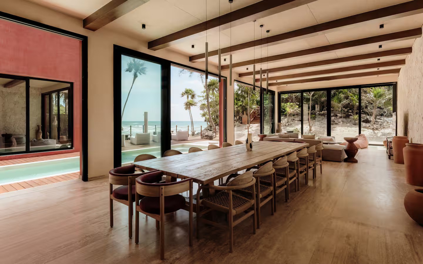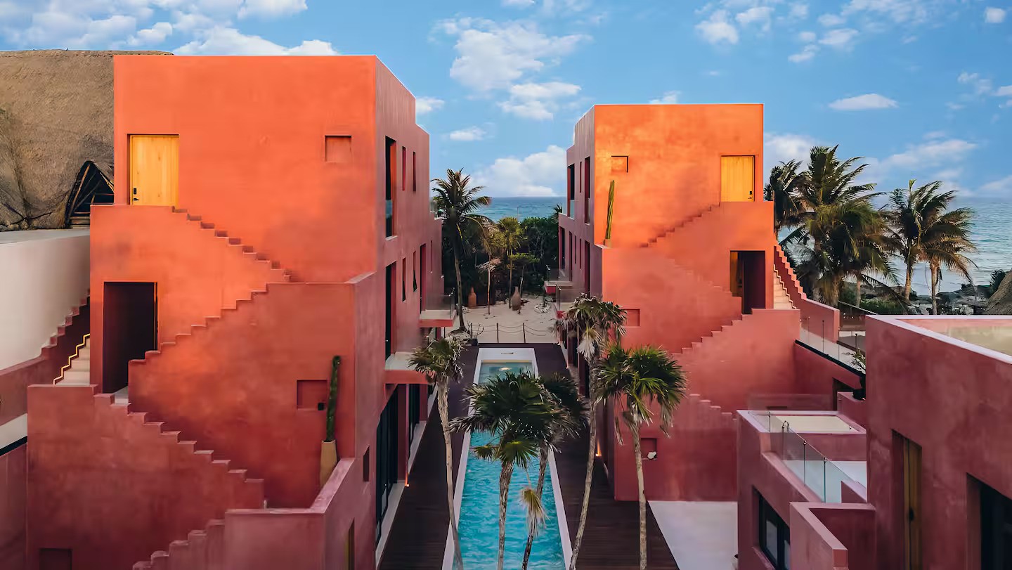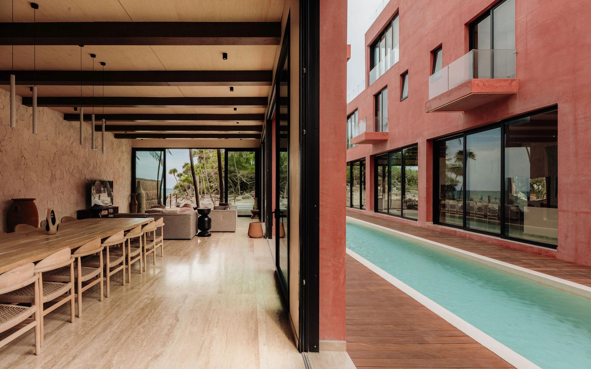 Proyecto arquitectónico desarrollado para arquitectura mixta. Casa vacacional en la playa con 8 habitaciones localizada en un predio costero en Tulum. La casa cuenta con dos bloques principales que convergen en torno a una alberca central. Se priorizaron las vistas de la terraza hacia al mar manteniendo el exterior hacia el camino costero lo mas privado posible.